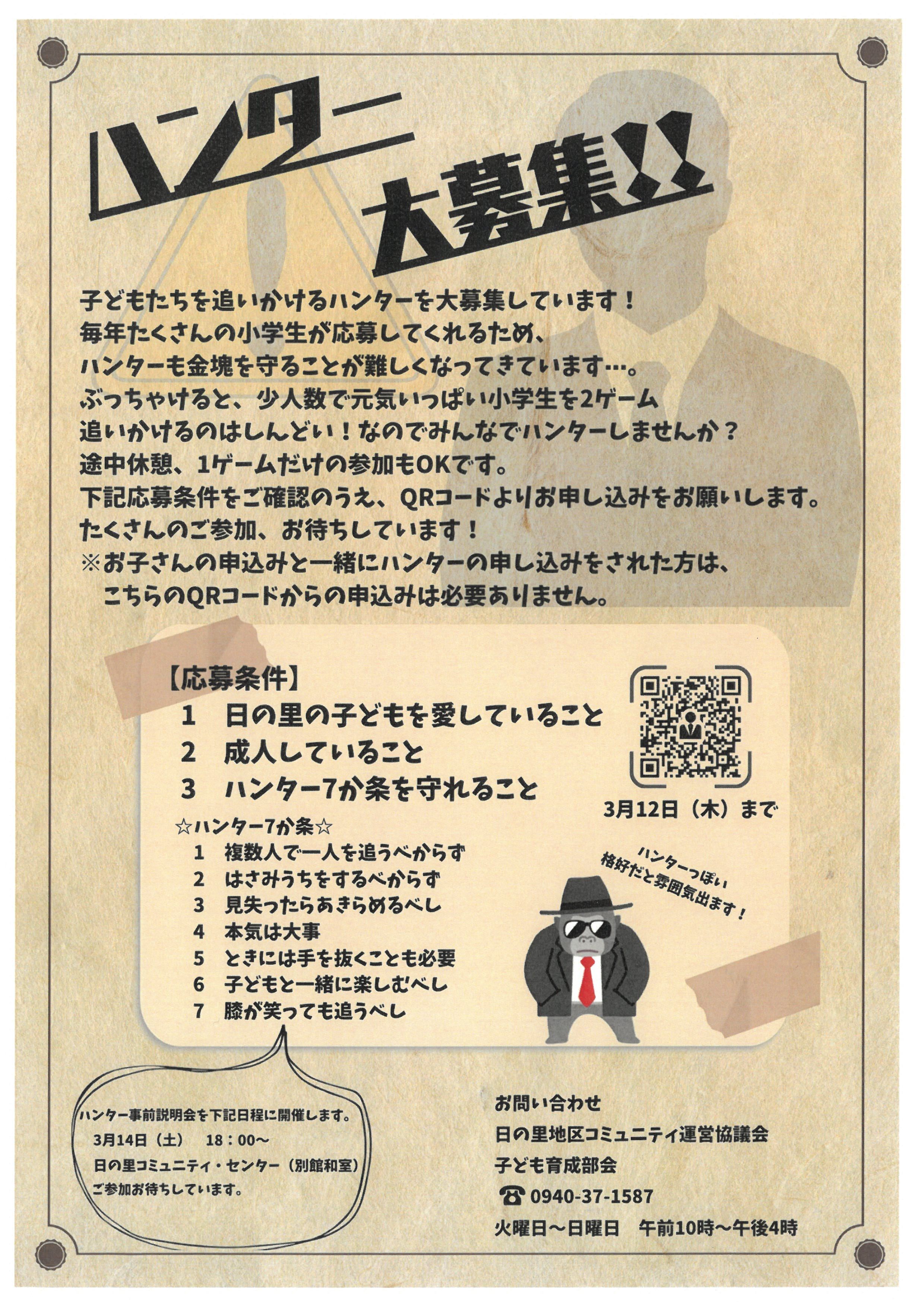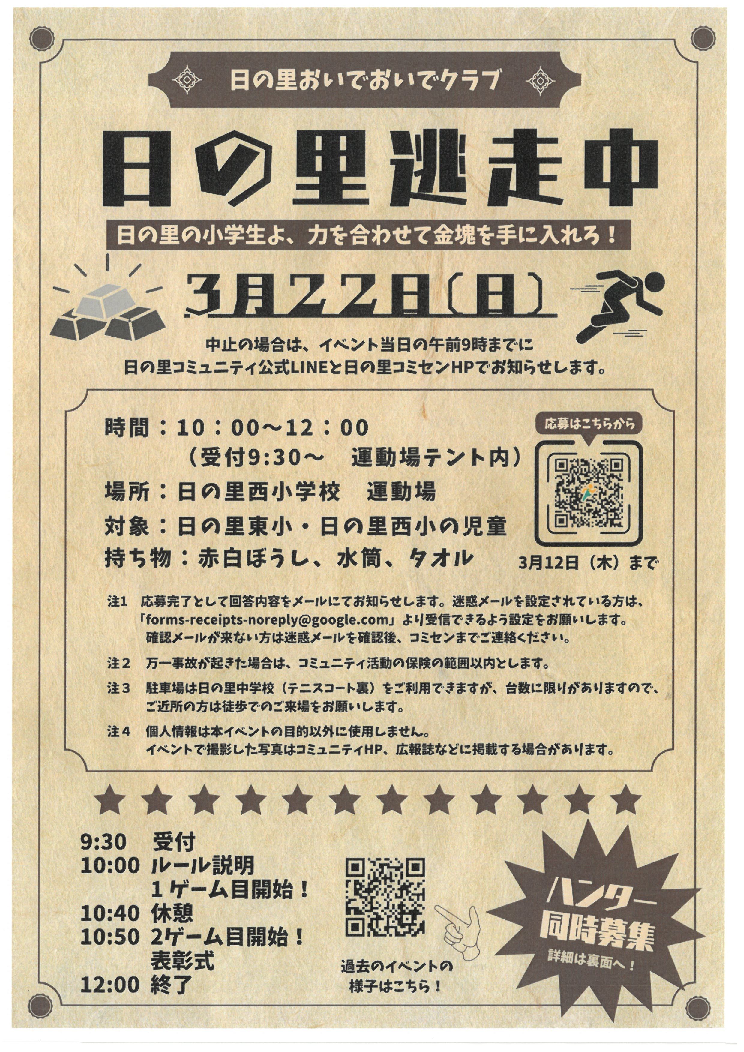 「日の里逃走中」を3月22日(日)10時~12時(受付9:30~)で日の里西小学校の運動場で開催します。元気いっぱいの小学生を追いかける「ハンター」を大募集しています。下記、URLよりご応募お願い致します。